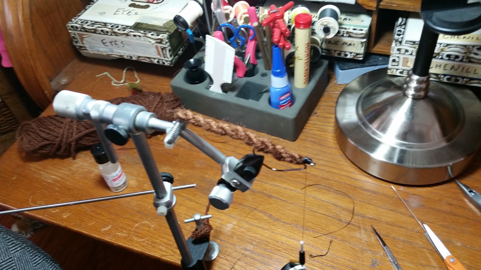 8) Remove clamp from worm and trim excess yarn from the hook eye end.